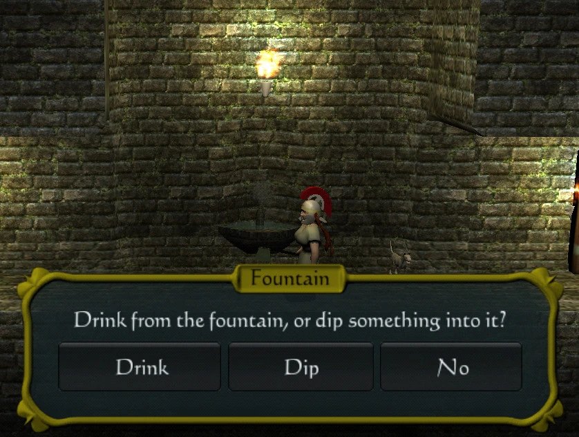 A flowing fountain will offer the player three options: Drink, dip, or no (cancel), See fountain wishes below for further information.